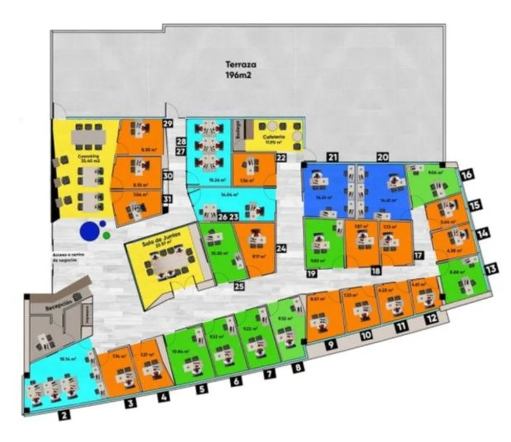 Esta moderna oficina con diferentes oficinas privadas para un espacio más personal pensado para iniciar y hacer crecer tu empresa, podrás encontrar una sala de juntas para todas tus reuniones, espacios coworking en el que compartirás espacios comunes. Ideal para emprendedores y profesionales que buscan un espacio de trabajo moderno y funcional.